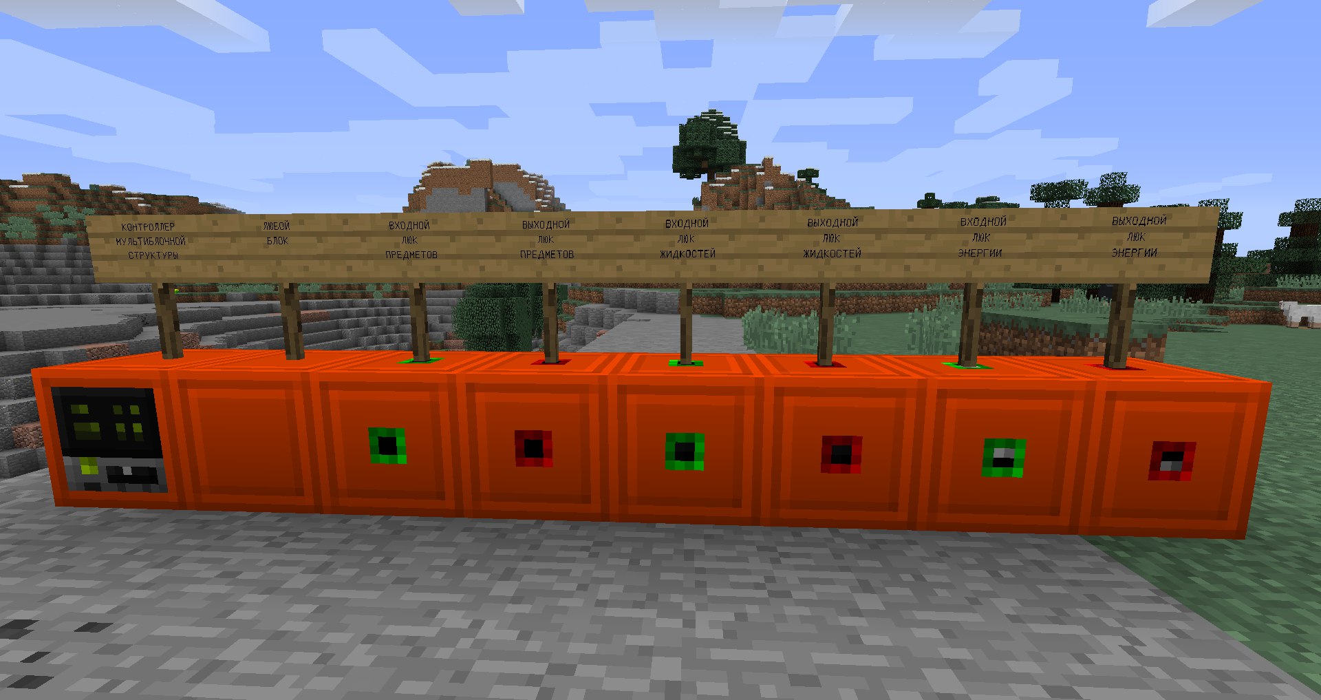 Центром нашей мультиблочной структуры является **контроллер**. Он предоставляет информацию о структуре и производимом рецепте. У каждого входного и выходного люка есть уровень, от Tiny до Ludicrous. Каждый уровень отличается размерами резервуара (например, у **Tiny** - 1 слот, а у **Ludicrous** - 32 слота). При создании базовой конструкции стоит использовать минимальный уровень.